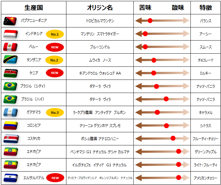 当店はスペシャリティ豆 / プレミアム豆の取り扱いの為、生産量が少ない豆も御座います。そのため生産国は同じでも、豆の種類が変わっていることがあります。同じ国の豆でもエリアや品種、精選方法などで味わい・風味も変わりますので、色々な豆を楽しんで下さい!詳しくはHPのラインナップでご確認下さい。