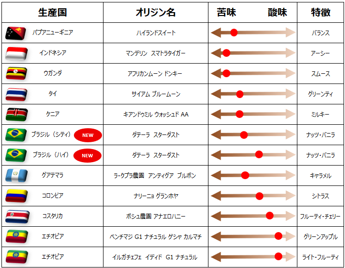 当店はスペシャリティ豆 / プレミアム豆の取り扱いの為、生産量が少ない豆も御座います。そのため生産国は同じでも、豆の種類が変わっていることがあります。同じ国の豆でもエリアや品種、精選方法などで味わい・風味も変わりますので、色々な豆を楽しんで下さい!詳しくはHPのラインナップでご確認下さい。